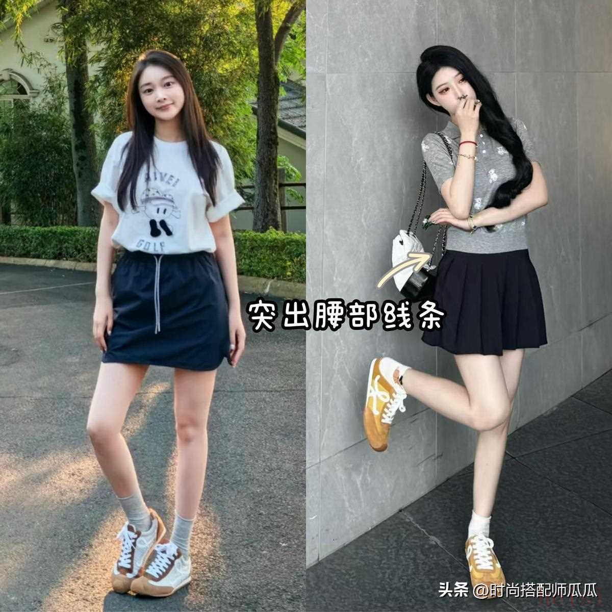 短上衣和運(yùn)動(dòng)短裙的搭配,通常要明示出腰線,裙裝露膚度高的前提下,上衣就不能太過(guò)暴露,選擇基礎(chǔ)款的T恤作為搭配,再配一雙短襪更顯腿長(zhǎng)。