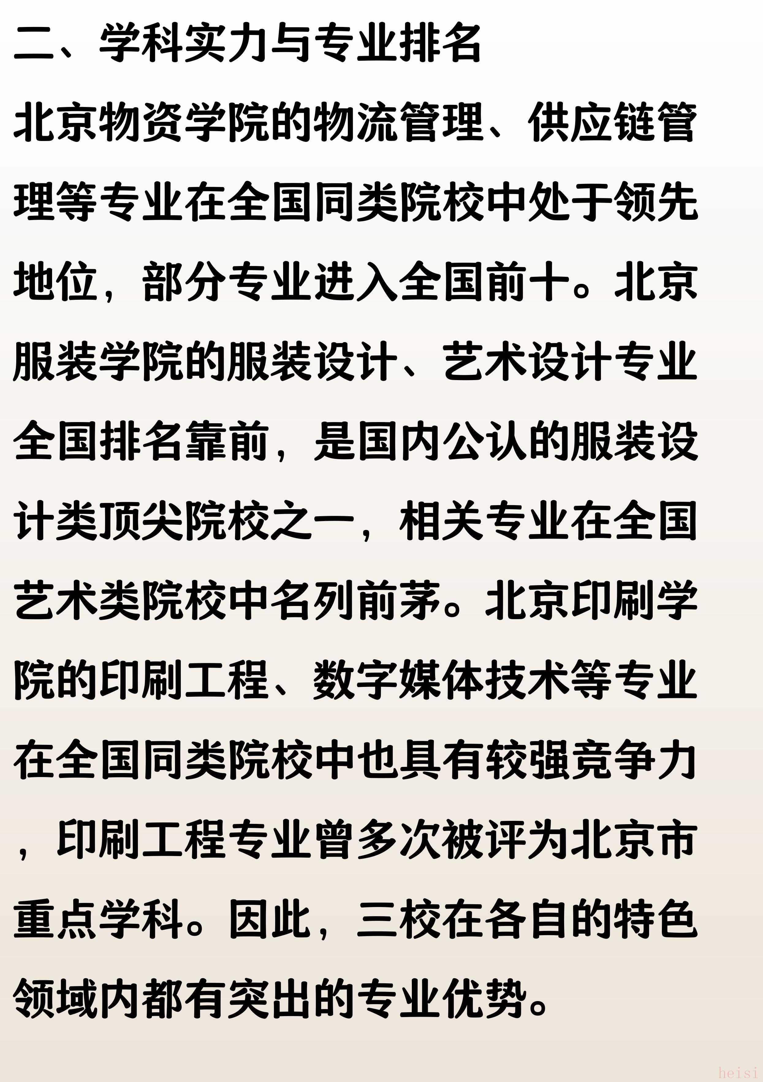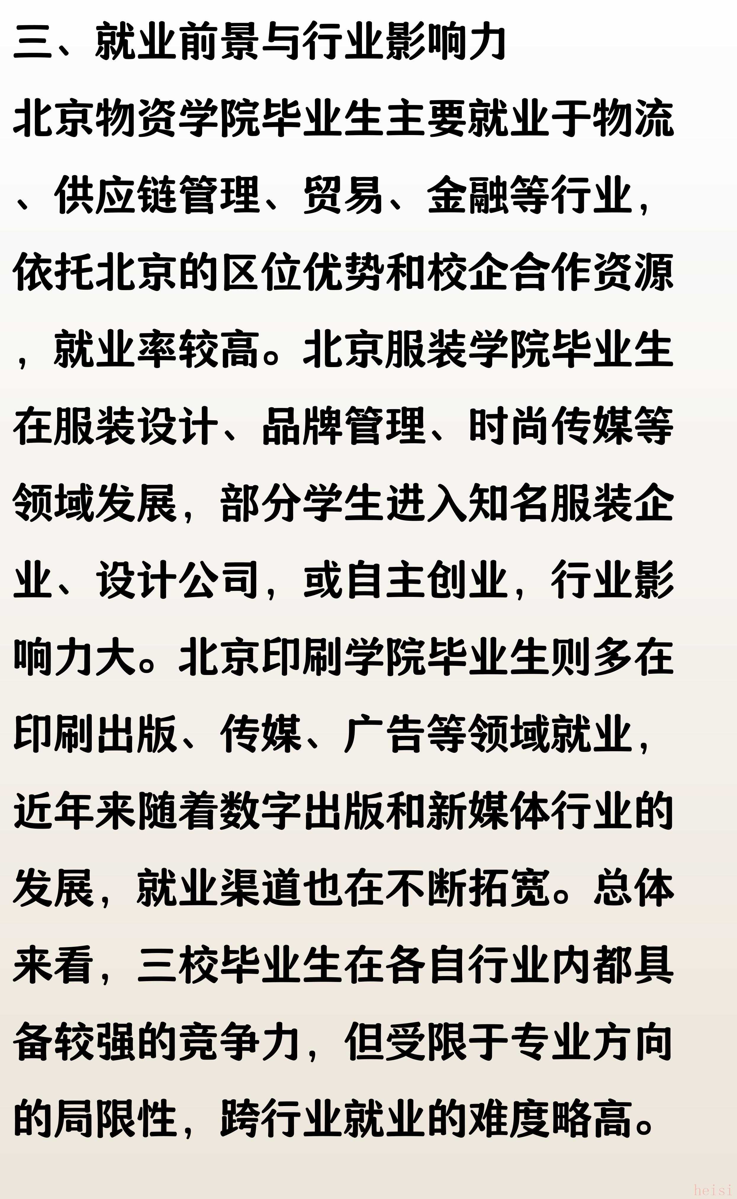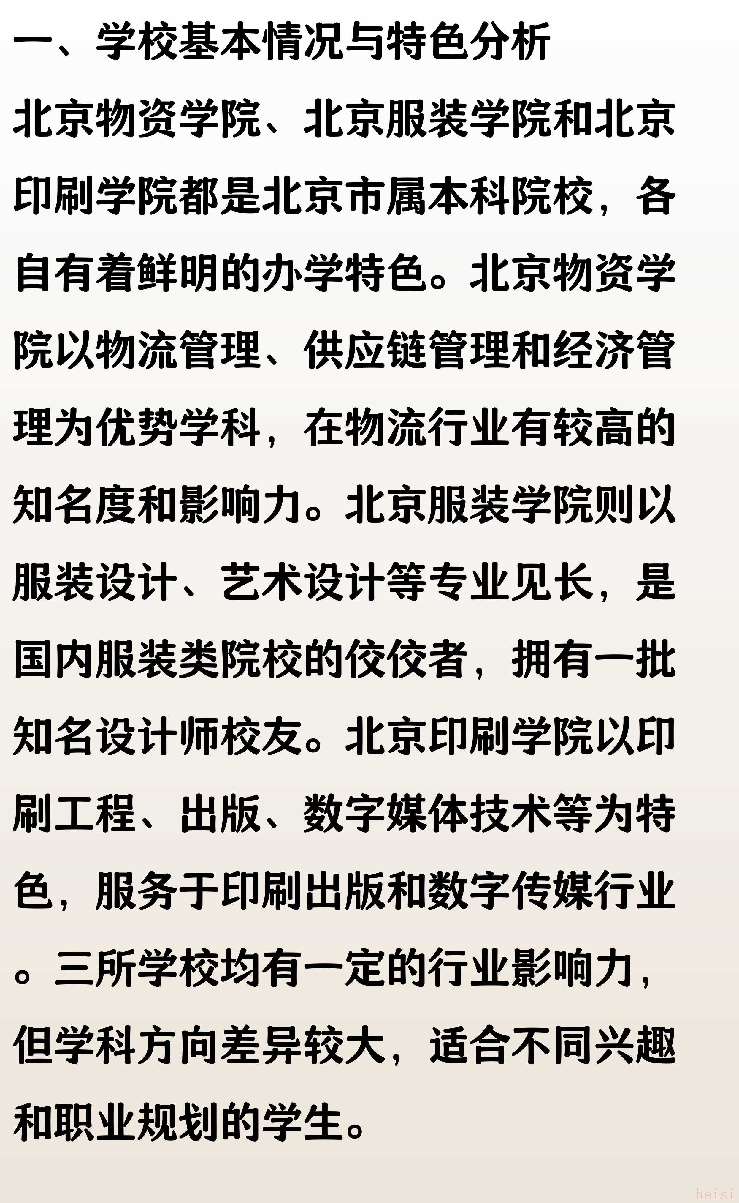 這三所大學(xué)都是位于北京的市屬本科院校,各有特色和優(yōu)勢(shì),選擇哪所“更好”很大程度上取決于你的"個(gè)人興趣、未來發(fā)展方向和看重的方面"。下面我?guī)湍惴治鲆幌赂髯缘奶厣?br/>1. "北京物資學(xué)院 (BWI)"