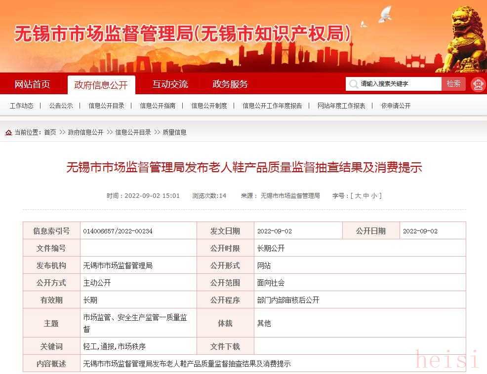 "標(biāo)題:" 江蘇省無(wú)錫市市場(chǎng)監(jiān)管局發(fā)布老人鞋產(chǎn)品質(zhì)量監(jiān)督抽查結(jié)果及消費(fèi)提示