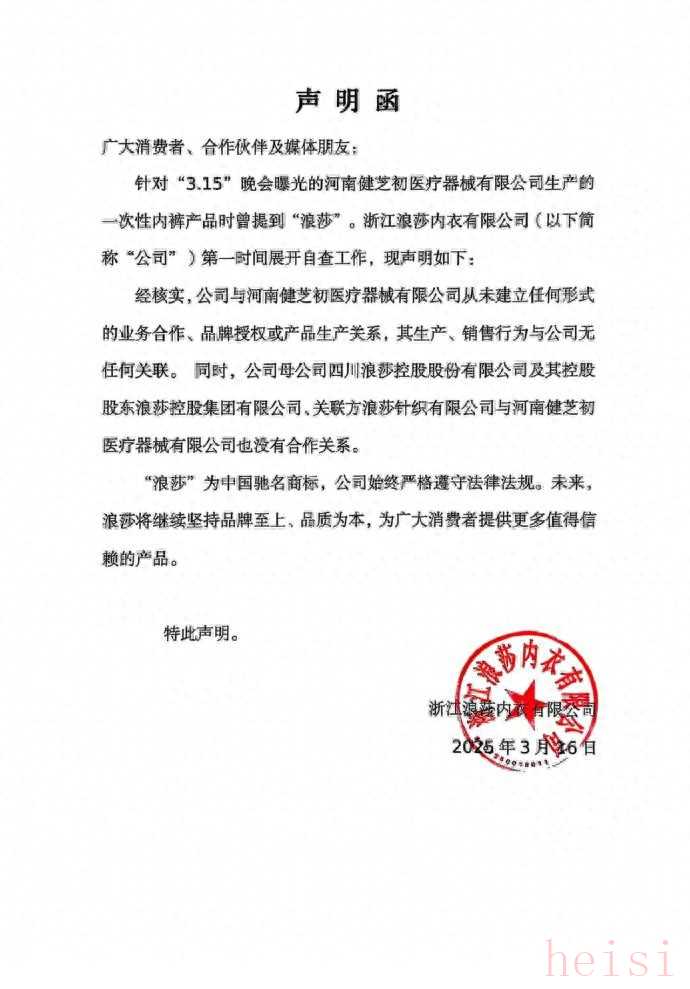 針對(duì)央視“3.15”晚會(huì)提及河南健芝初醫(yī)療器械有限公司違規(guī)使用我司品牌名稱事件,浙江浪莎內(nèi)衣有限公司鄭重聲明: