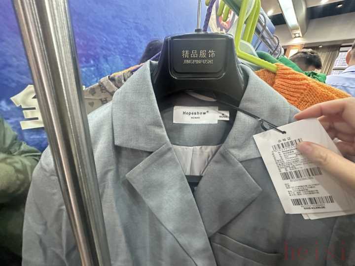 從吊牌來看,與正品無異,價(jià)格也打著市場價(jià)。但領(lǐng)口商標(biāo)處卻有細(xì)微差別,正品的為“HOPESHOW”,現(xiàn)場高仿品則是“Hopeshow”英文小寫。