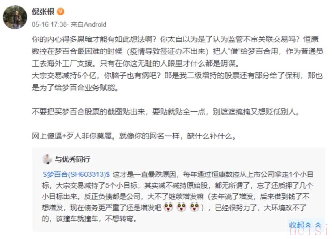 2021年,46歲的倪張根入選2021年江蘇省勞動模范和先進工作者名單,成為一名勞模。2021年3月,蘇伊士運河發(fā)生貨輪擱淺事故,倪張根透露那個貨輪上有夢百合十幾個貨柜的貨物,直接影響到他們在西班牙的生意。倪張根說自己從2021年下半年開始,他會有些焦慮,因為他們參與的國際化經(jīng)營已經(jīng)很深入了,但越來越多的因素變得不可控。比如2022年2月,俄烏戰(zhàn)爭開始第一天,夢百合的銷售下跌了35%。2023年12月,紅海發(fā)生商船被炸事件,上面也有夢百合2個貨柜的產(chǎn)品。2022年5月,一位雪球網(wǎng)友曾質(zhì)疑倪張根轉(zhuǎn)讓股份套現(xiàn),倪張根也沒慣著,十分直接的回懟,甚至用上了國罵。