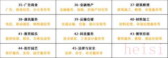 以下是對(duì)45個(gè)類(lèi)別的簡(jiǎn)要說(shuō)明(請(qǐng)注意,這只是概述,具體商品/服務(wù)需參考《類(lèi)似商品和服務(wù)區(qū)分表》):
