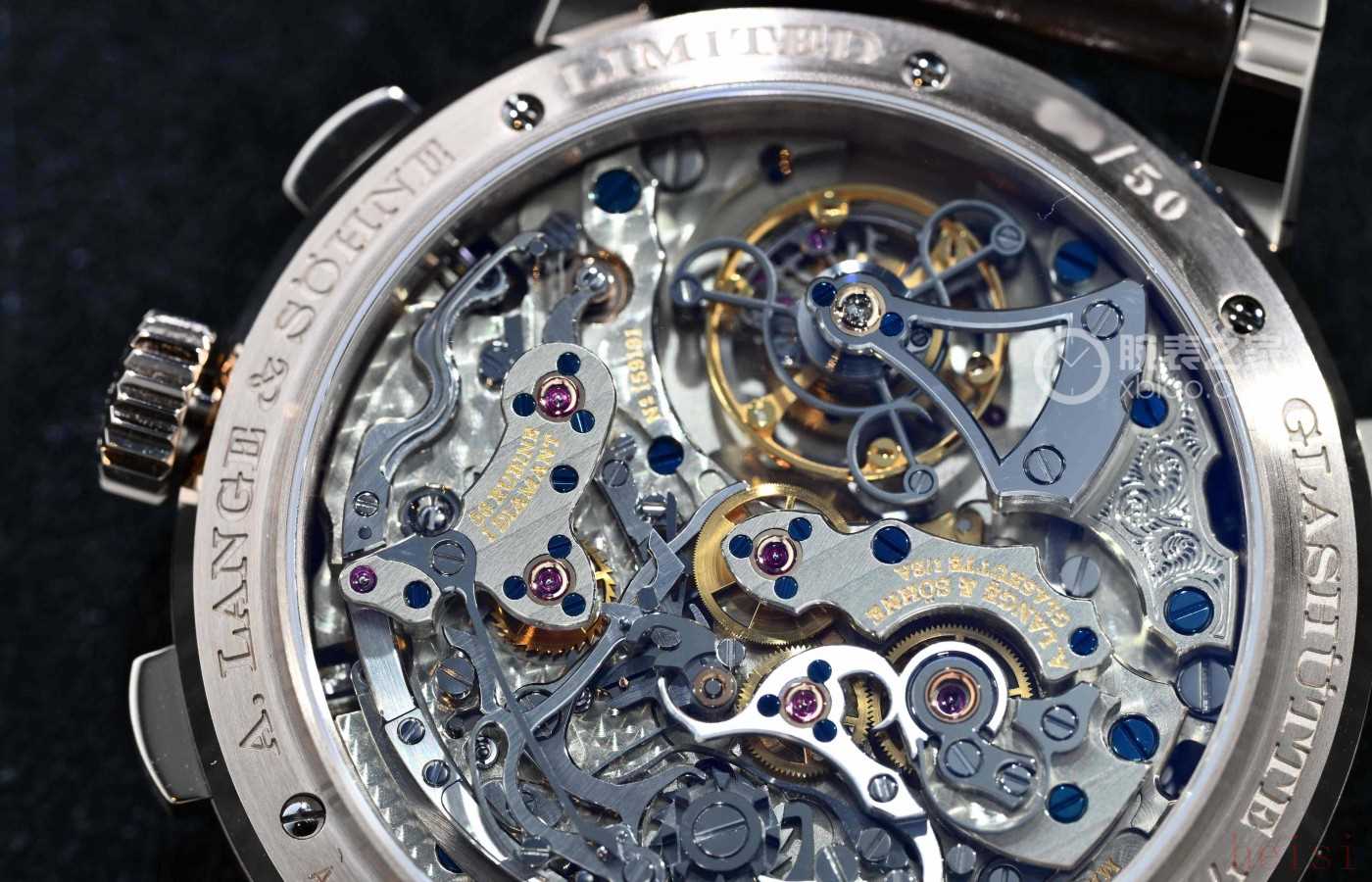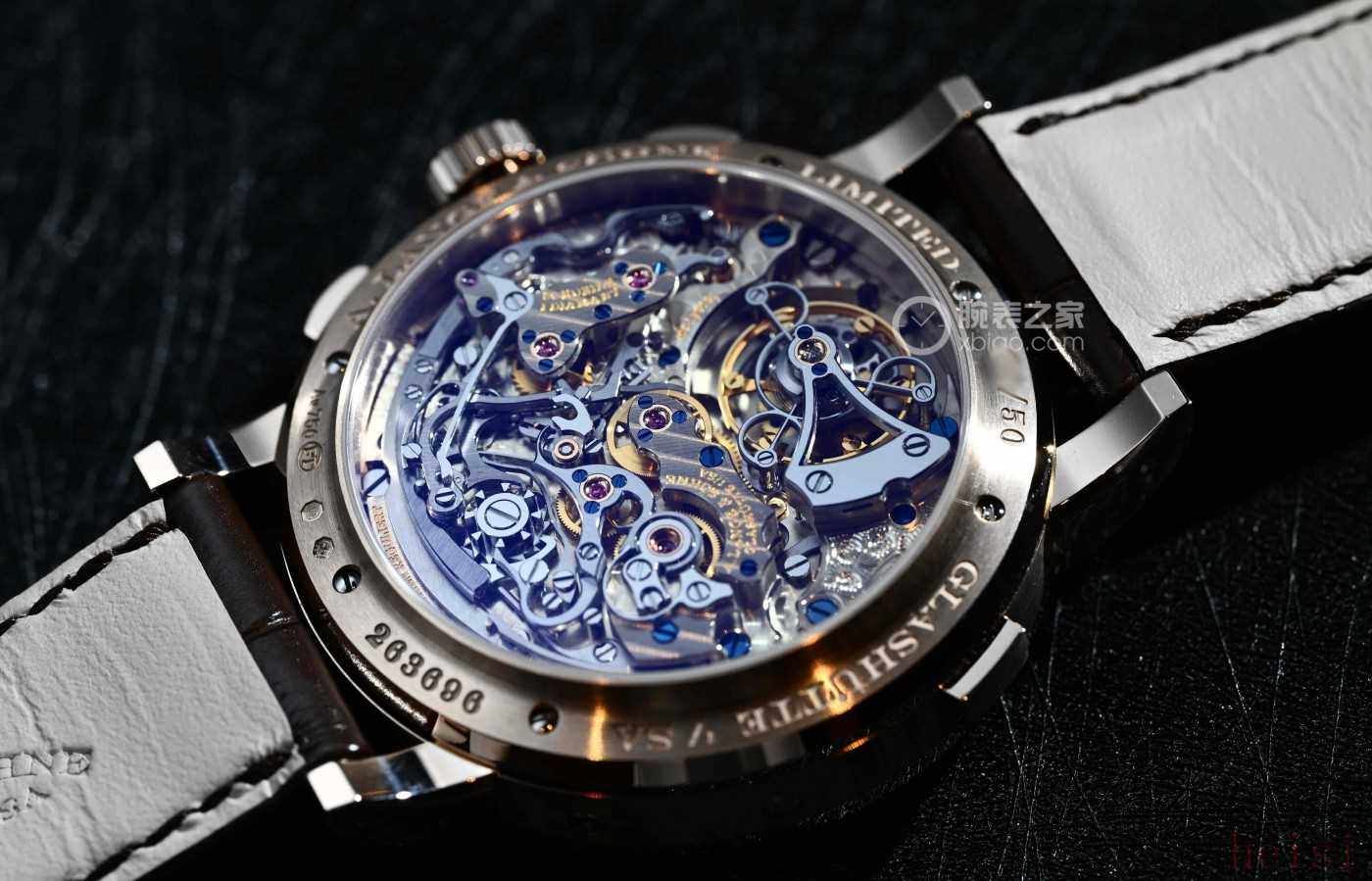 內(nèi)部搭載的是L952.4 型自制機(jī)芯,由684 個(gè)零件組成,以每小時(shí) 18,000 次(2.5 赫茲)的頻率振動(dòng),具備有50小時(shí)的動(dòng)儲(chǔ)能力。此外,可自由擺動(dòng)的朗格游絲、偏心平衡擺陀的朗格擺輪也都保證了極為出色的穩(wěn)定性。