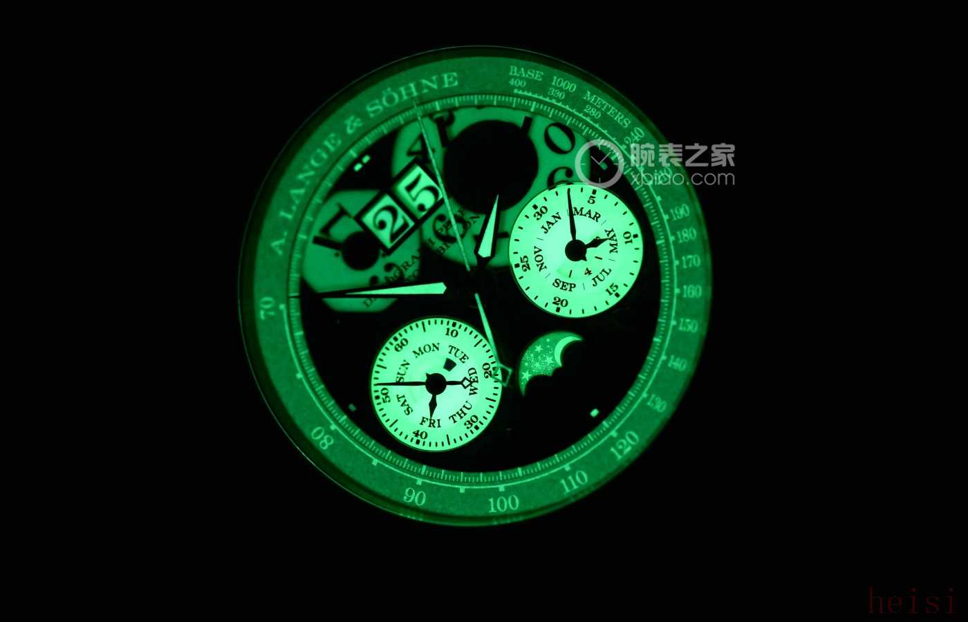 就拿這塊來(lái)說(shuō),大日歷窗、兩個(gè)副盤(pán)、月相盤(pán)、時(shí)針?lè)轴?、中央?jì)時(shí)秒針、甚至還有最外圈的測(cè)速刻度圈……在昏暗情況下依舊能完完整整看清盤(pán)面的每一處信息,夸張得可怕。