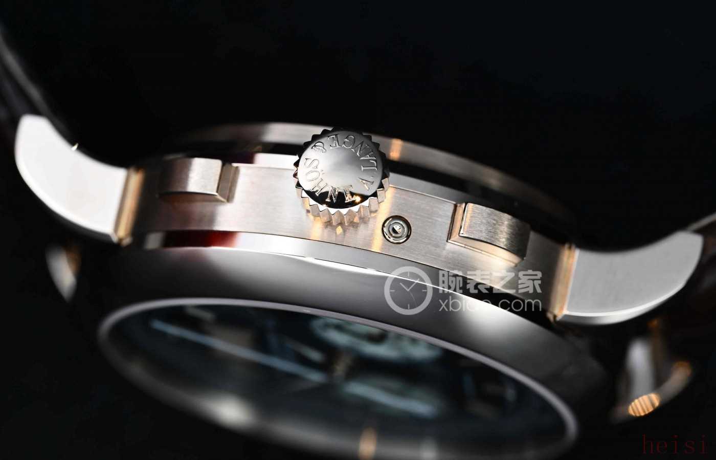 41.5毫米的表徑,14.56毫米的厚度,左側(cè)10點(diǎn)位有萬(wàn)年歷快速調(diào)校按鈕,而右側(cè)則是表冠以及兩個(gè)計(jì)時(shí)按鈕,除此之外,表殼側(cè)面還有三個(gè)調(diào)校器可以分別調(diào)整月相顯示、星期、月份和平閏年。整個(gè)表殼采用上下兩層拋光處理,中間部分則是大面積橫向拉絲。