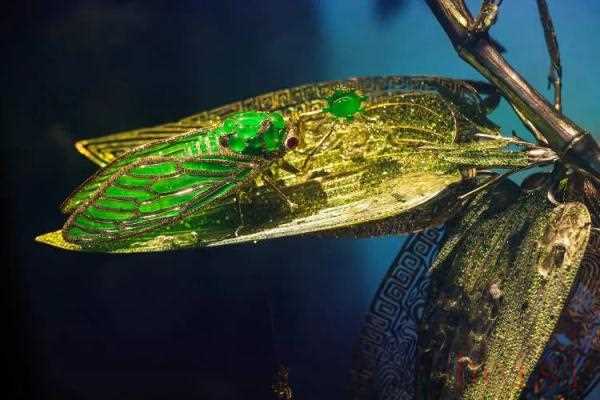 古代中國以農(nóng)立國,蟬自古為人歌頌,被視為豐收、高潔、重生的象征。由于氣溫愈高,蟬鳴聲愈大,古人以蟬為“神之使者”和最準確的“氣候監(jiān)測儀”。《悟蟬知翠》中,蟬抱一顆帝王翡翠,背面鑲一顆溫潤的紫羅蘭翠玉——極薄的翅膀則運用了陳世英2002年發(fā)明的“翡翠切割潤光專利技術(shù)”。