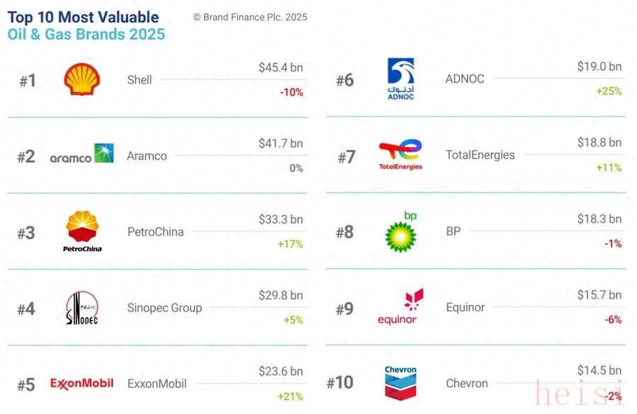 英國品牌評估機(jī)構(gòu)“品牌金融”(Brand Finance)發(fā)布“2025全球能源品牌價(jià)值100強(qiáng)”榜單(Energy 100 2025)。其中,在“2025全球石油和燃?xì)馄放?0強(qiáng)”(Most Valuable Oil & Gas Brands 2025)中名列前十位的品牌是:殼牌、沙特阿美、中石油、中石化、??松梨?、ADNOC、道達(dá)爾、英國石油、挪威國家石油和雪佛龍。