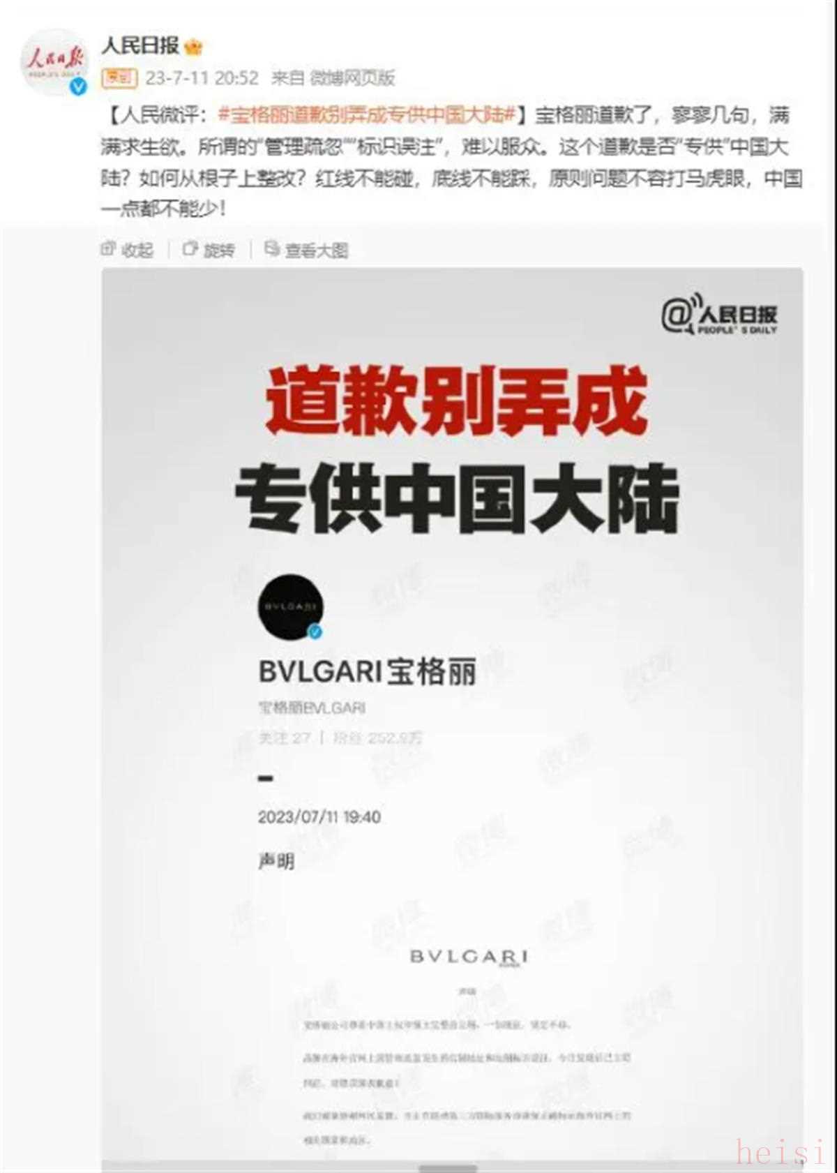 人民日報微評稱:寶格麗道歉別弄成專供中國大陸!寥寥幾句,滿滿求生欲。所謂的“管理疏忽”“標(biāo)識誤注”,難以服眾。這個道歉是否“專供”中國大陸?