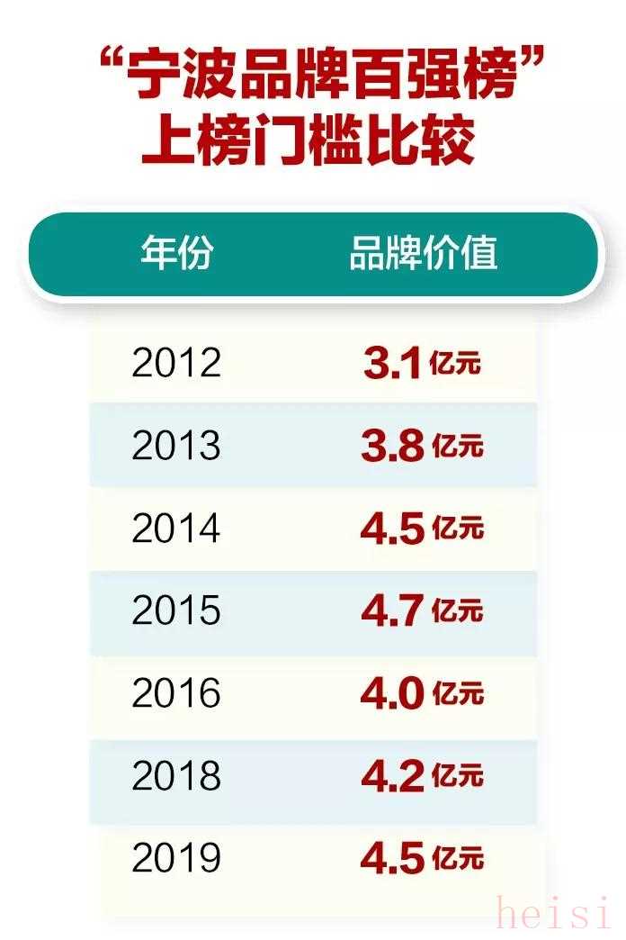 對(duì)照近年榜單,記者發(fā)現(xiàn),寧波品牌經(jīng)過2016年“寒冬”后,2018年開始回暖,2019年再創(chuàng)新高。以寧波品牌百?gòu)?qiáng)榜上榜總價(jià)值為例,2018年為3490.0億元,今年這一數(shù)值升至3839.5億元;2018年品牌價(jià)值門檻4.2億元,今年2019第100名的門檻已升至4.5億元。品牌價(jià)值和門檻實(shí)現(xiàn)“雙升”。