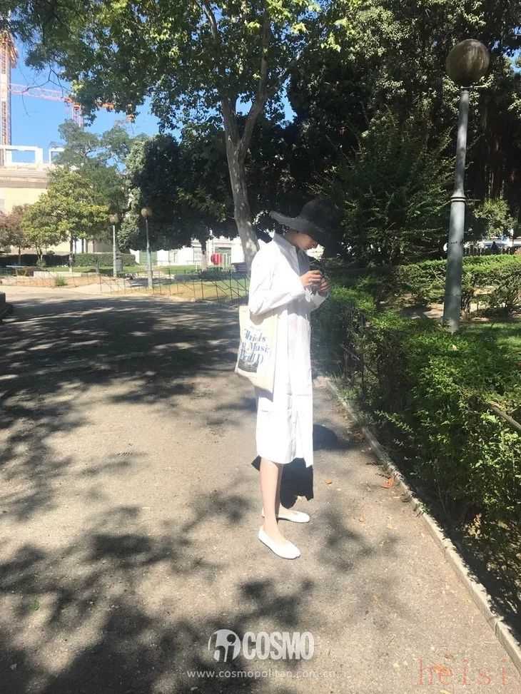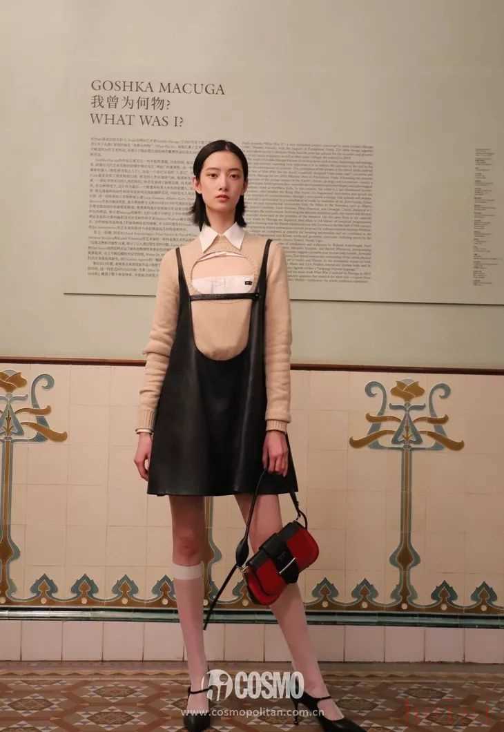 Prada黑色背帶裙搭配白色薄紗長筒襪,這種學(xué)生氣也只有Cici可以ho住了…