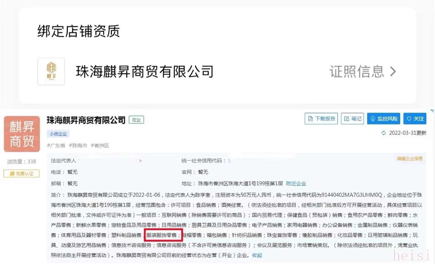 并且據(jù)調(diào)查發(fā)現(xiàn),Cici的個(gè)人平臺(tái)也關(guān)聯(lián)了一家“珠海麒昇商貿(mào)有限公司”,而這家公司的主營(yíng)業(yè)務(wù),就包括了“服裝零售”這一項(xiàng),因此也不排除Cici在為自家服裝品牌打廣告的可能性。