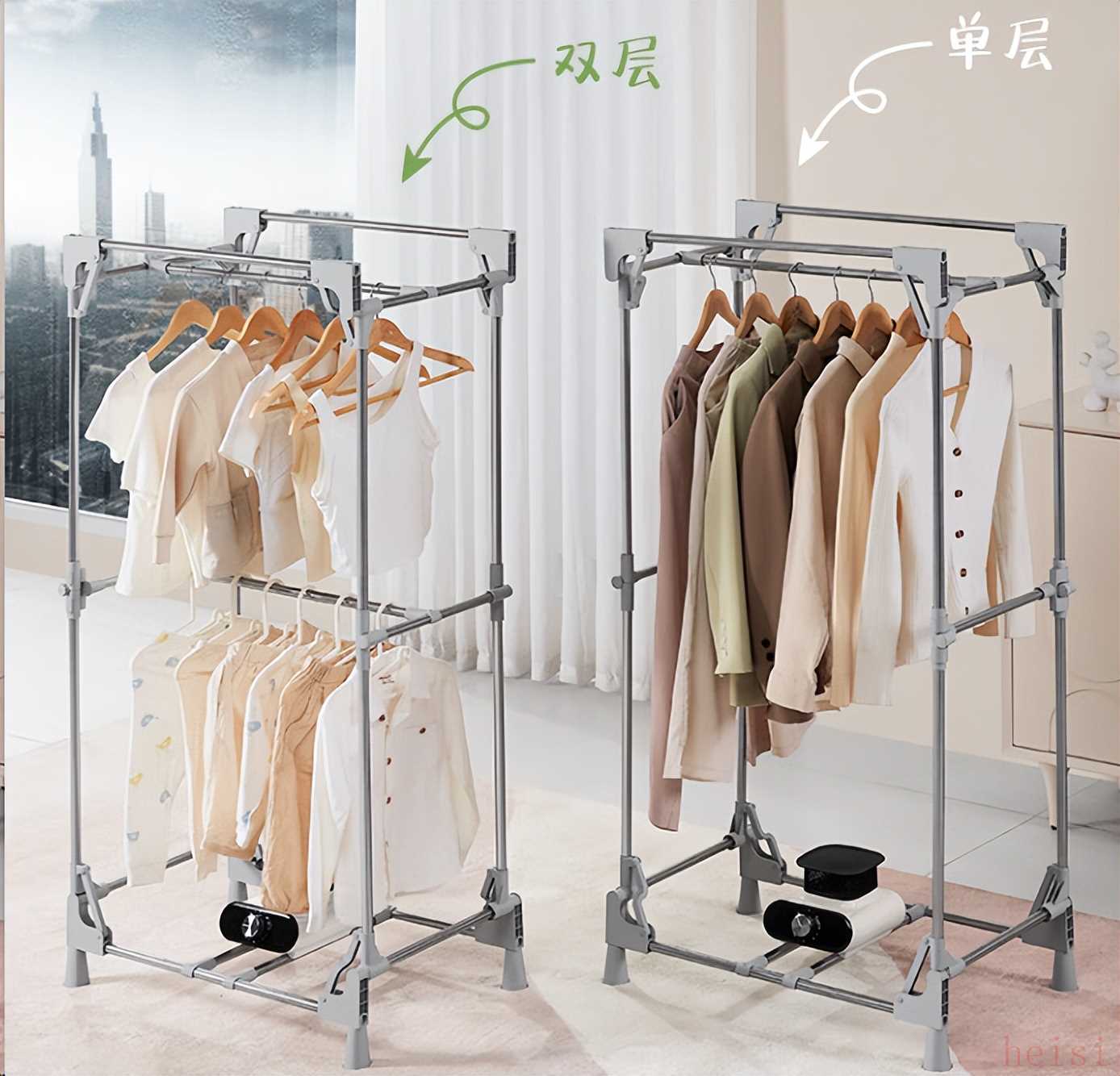 使用體驗:我用蘇泊爾ELD-511A覺得淡綠菱格外罩美觀清新,兩根鋼管拔起后,可以變換單雙層,掛大衣方便。
