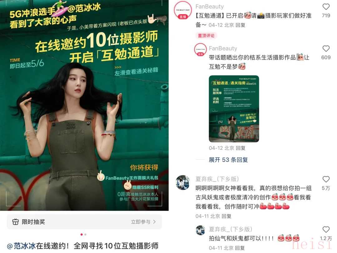 一整套流程下來,仿佛一場商業(yè)氣息濃厚的選秀。對素人攝影師而言,雖然被選中的概率并不高,但在頂流明星的誘惑下,仍有大量攝影博主投身于這場由品牌發(fā)起的商業(yè)游戲——畢竟,那可是范冰冰,而攝影圈廣為流傳得攝影三要素就是“模特美,模特美,模特美”。