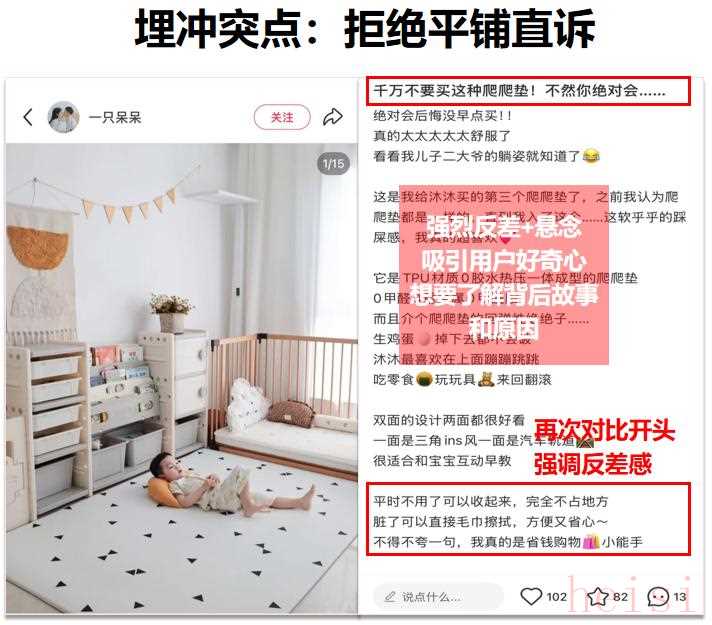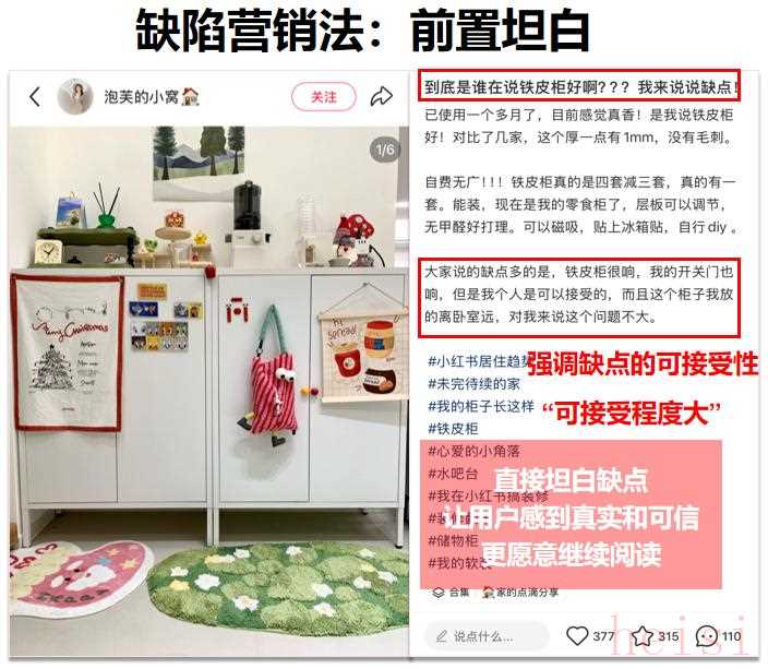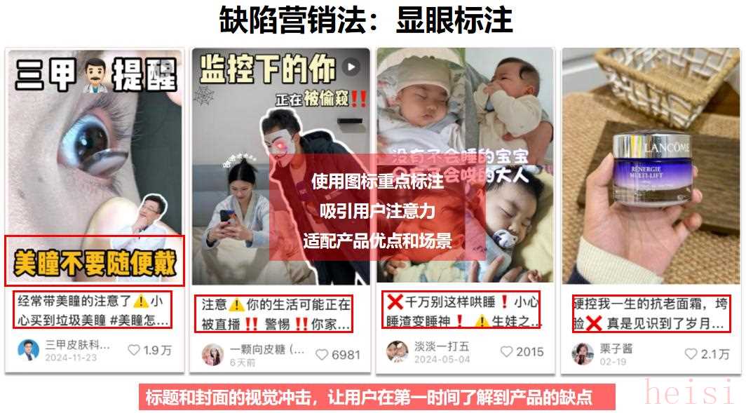 通過坦白產(chǎn)品的缺點、明確適合人群和提前告知風(fēng)險,可以建立用戶的信任并提高內(nèi)容的吸引力。同時,通過視覺配合,如用紅色馬克筆標(biāo)注缺陷,可以進一步吸引用戶的注意力,增強內(nèi)容的效果