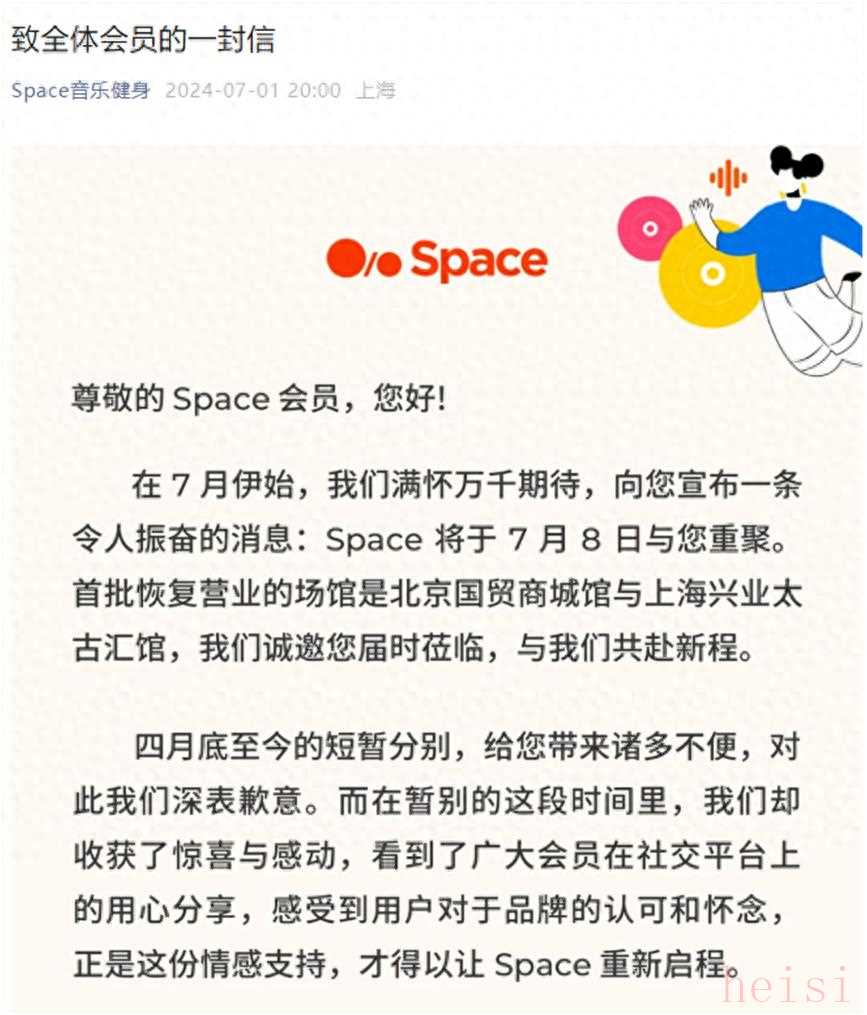 紅星資本局注意到,7月1日,Space官方微信公眾號(hào)“Space音樂健身”發(fā)布了《致全體會(huì)員的一封信》,Space表示,將于7月8日與會(huì)員重聚。就在兩個(gè)月前,Space曾宣布4月30日后無法再繼續(xù)運(yùn)營(yíng),是“無奈的選擇”。