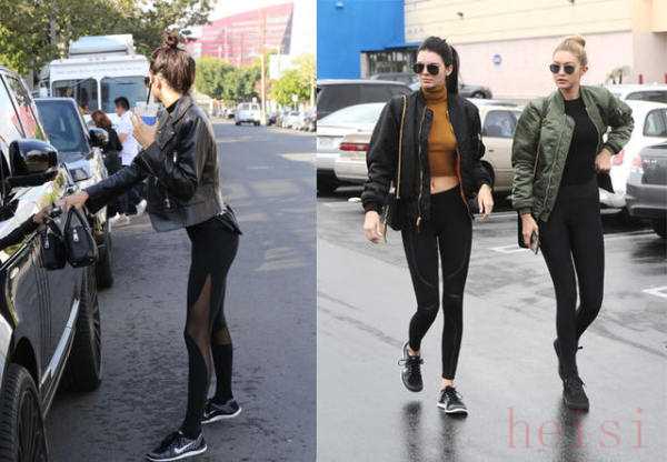 運動系的打底褲,要領是高腰提臀修身,和飛行員夾克或大廓形短羽絨服搭配起來都很適合凹造型,比如 GIGI 的日常出街造型。