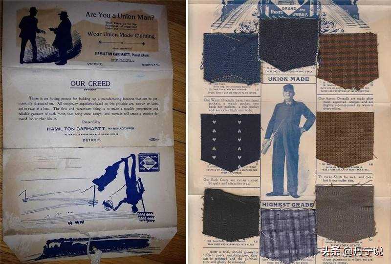 在美國內(nèi)戰(zhàn)的時候,法蘭絨的汗衫在士兵中也很受歡迎。后來工業(yè)革命為英國帶來了機械化的紡織機,使法蘭絨的生產(chǎn)變得更快、更容易。于是有一家叫Hamilton Carhartt(漢密爾頓·卡哈特)的公司看到工作服商機,他們把法蘭絨制成工作服,販賣給修鐵路的工人,從此名氣大噪。下圖為1940年Carhartt樣品傳單