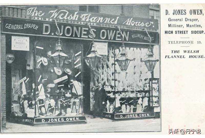 雖然威爾士和蘇格蘭一直以其格子圖案聞名,但并非所有格子圖案都是法蘭絨,就像并非所有法蘭絨都是格子圖案一樣。同樣也沒有人完全確定這個名字的來源,從歷史上,法國人稱其為flanelle,德國人稱其為 Flanell。無論他們?nèi)绾畏Q呼它,這種簡單保暖的法蘭絨就這樣從歐洲流行開了。下圖為20世紀(jì)初的威爾士法蘭絨店。
