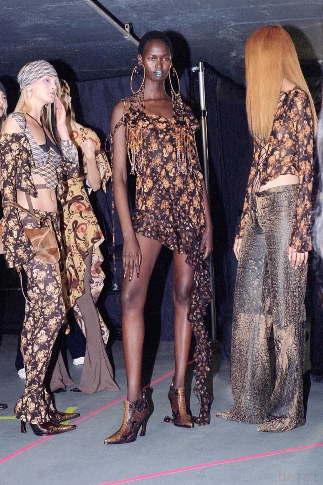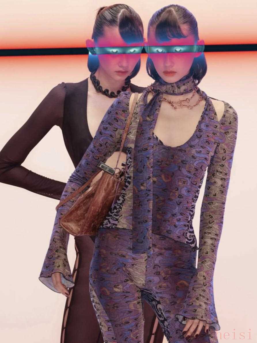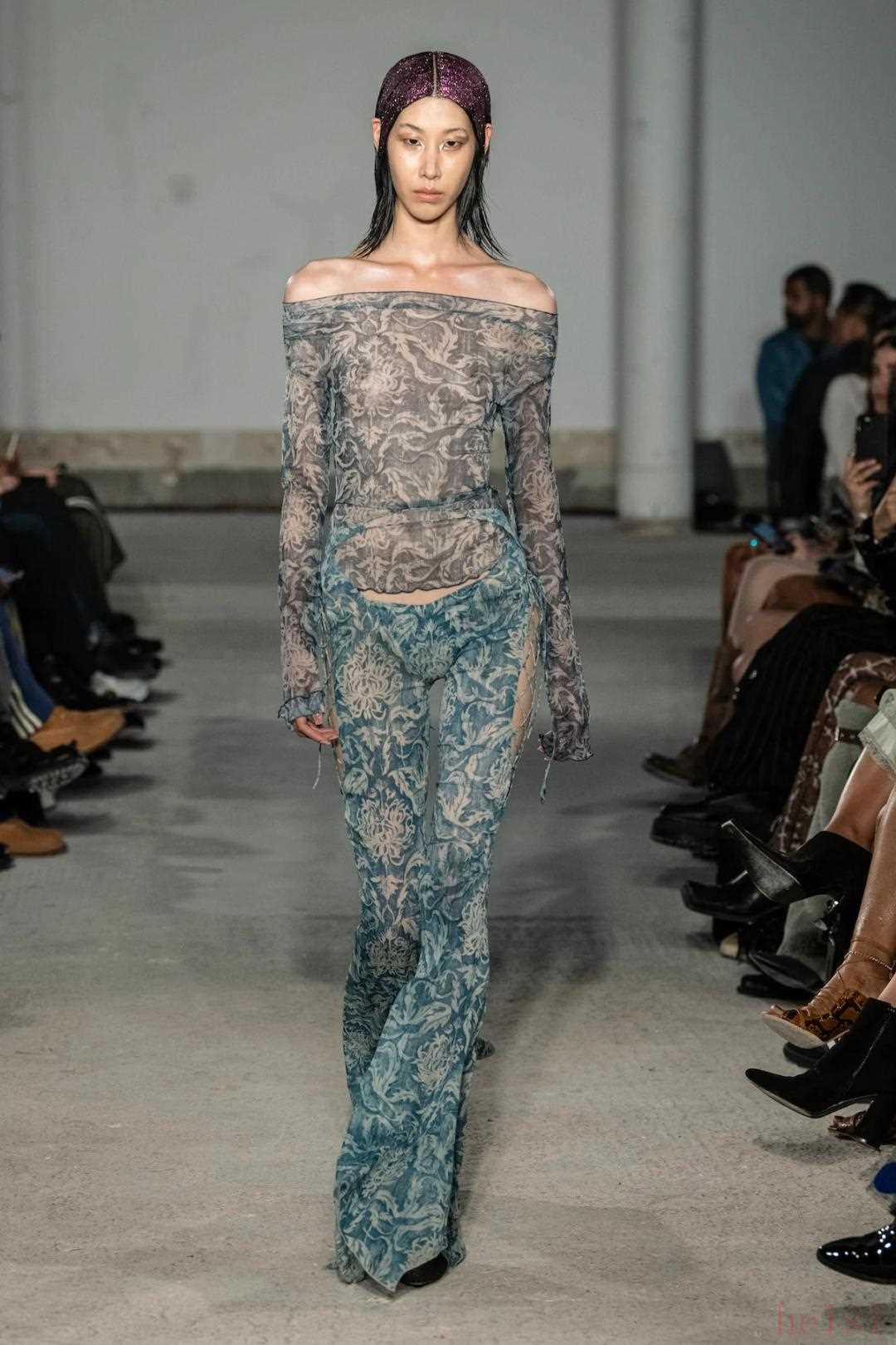 再一種是輕如蟬翼的透明面料。它們經(jīng)常與各種迷幻印花搭配出現(xiàn),像覆在身體上的紋身,性感又危險。