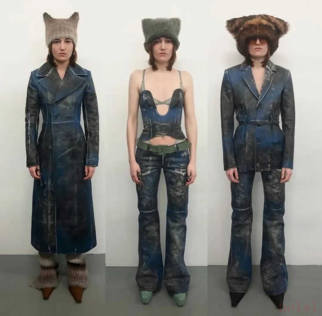 一種是浸透了厚重歲月的皮革和牛仔。設(shè)計師通過特殊工藝將這種粗獷的面料故意處理成做舊感,包括劃痕,泛白,斑駁等磨損細(xì)節(jié)。