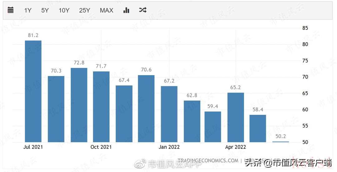 (來(lái)源:Tradingeconomics)通脹指數(shù)和消費(fèi)者信心指數(shù)的一升一降,表明了在目前的情況下,普通民眾的消費(fèi)能力及意愿都大幅縮水。