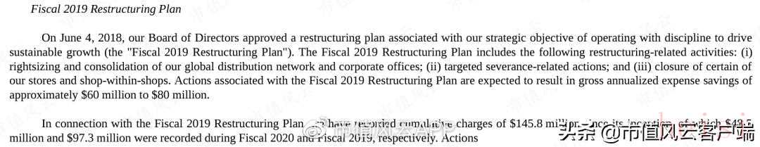 2020財(cái)年,在新CEO的帶領(lǐng)下,RL又開起了新一輪的重整計(jì)劃:關(guān)閉表現(xiàn)不佳的門店及辭退員工,依然是新重整計(jì)劃中的主要?jiǎng)幼鳎送膺€包括將一批老舊資產(chǎn)進(jìn)行減值等等。