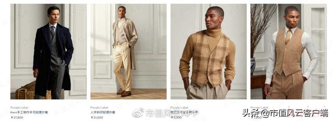 紫標(biāo)系列的價(jià)格又比RRL更高了一個(gè)檔次,也是RL所有系列中定價(jià)最貴的,單間羊毛長(zhǎng)外套價(jià)格接近3萬(wàn)元人民幣,一件單獨(dú)的馬甲也高達(dá)7800元。