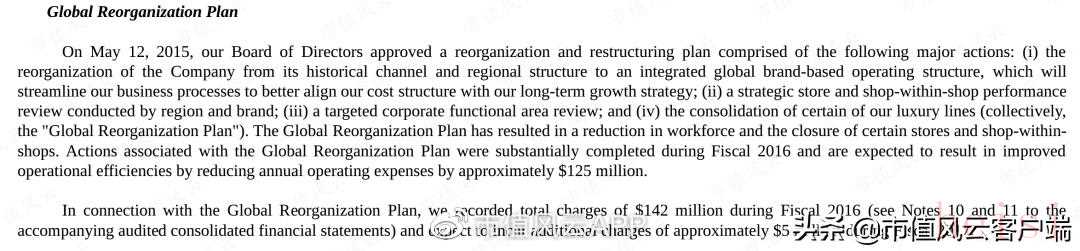(來(lái)源:公司公告)不過(guò)在計(jì)劃執(zhí)行的兩年當(dāng)中,RL的業(yè)績(jī)似乎依然在下滑,尤其是2017財(cái)年,凈利潤(rùn)也由盈轉(zhuǎn)虧至-1%,導(dǎo)致時(shí)任CEO以離職收?qǐng)觥?/span>