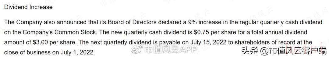 并且在四季度報(bào)中,公司還宣布董事會(huì)已批準(zhǔn)將季度股息支付比例提高9%,全年將達(dá)到美股3美元/股的水平;另外還將繼續(xù)回購(gòu)3.7億美元股份。