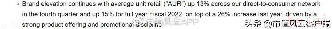 (來(lái)源:市值風(fēng)云APP)回到RL。根據(jù)財(cái)報(bào)披露,2022財(cái)年,RL的平均單位售價(jià)(AUR)在2021財(cái)年已經(jīng)增長(zhǎng)26%的基礎(chǔ)上,繼續(xù)增長(zhǎng)了15%。