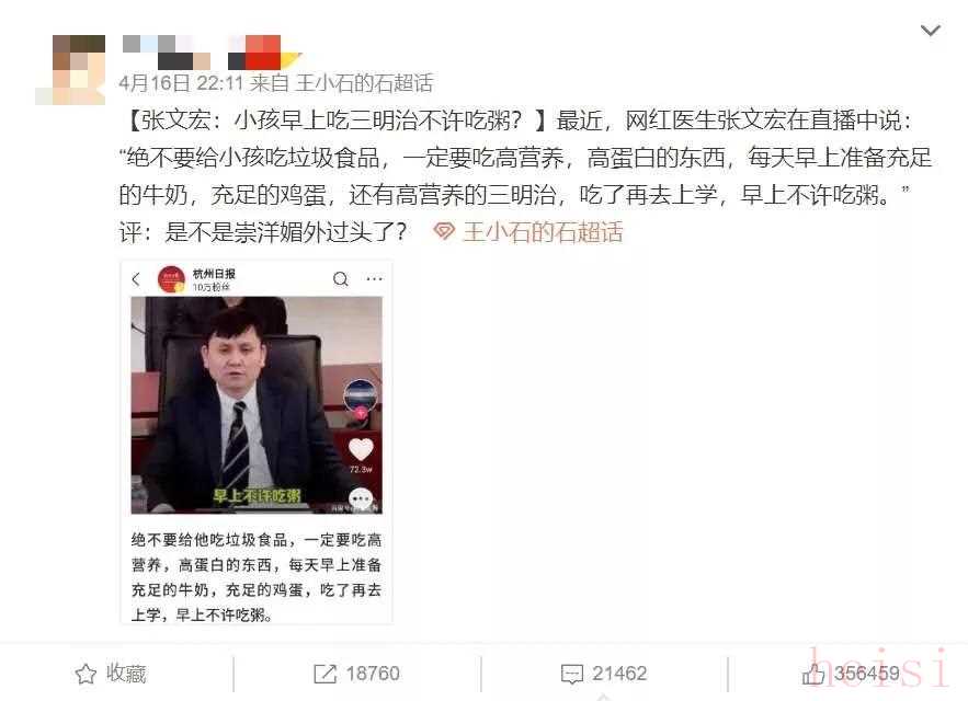張文宏醫(yī)生不讓喝粥事件告訴我們,中國人對于牛奶的認(rèn)知并不足夠,怎么能邁過牛奶時代進(jìn)入后牛奶時代呢?/微博用戶從根據(jù)成分的優(yōu)點(diǎn)購買食品,轉(zhuǎn)變?yōu)橄M(fèi)時只看“它不含什么”,我們正在走向更深層次的食物焦慮。越來越多的人選擇植物奶,并不是因?yàn)樗麄內(nèi)樘遣荒停菍θ樘堑雀鞣N食物成分本身的焦慮。 此時再討論植物奶是健康觀念進(jìn)步的消費(fèi)升級,還是花錢買智商的消費(fèi)陷阱,已經(jīng)無甚意義。我們只需要明白一點(diǎn),并不是喝不到植物奶的人就無法真正健康,也不是當(dāng)所有人都喝植物奶時,這個世界才會更好。 所以,少焦慮一點(diǎn),生存和生活都是。