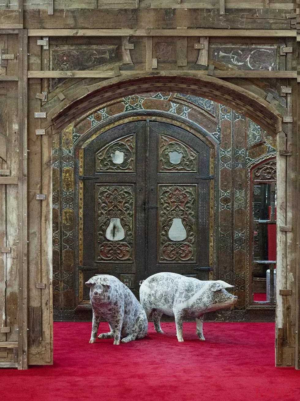 他的藝術(shù)創(chuàng)作有兩個(gè)核心,一個(gè)是優(yōu)雅圖案的裝飾世界,一個(gè)是排泄物的世界。關(guān)于后者,他創(chuàng)作了最有名的“造糞機(jī)器”《泄殖腔》,用一臺(tái)機(jī)器模擬人的消化系統(tǒng)。關(guān)于前者,他把一腔愛意都給了這些豬。
