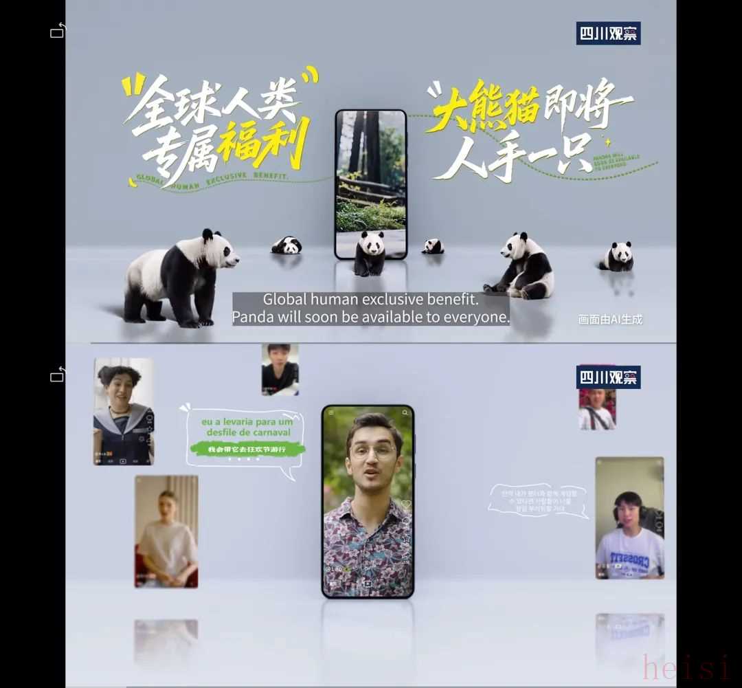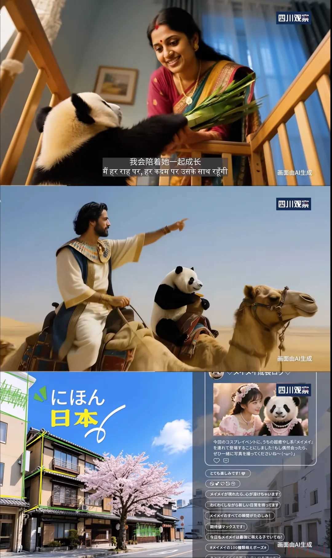 活動當(dāng)日,巴西、哥倫比亞、俄羅斯、希臘、烏克蘭等10多位國際友人參與,同步在油管、臉書、推特、照片墻、抖音海外版5個海外平臺發(fā)布相關(guān)內(nèi)容,共發(fā)布系列視頻22條,播放量超46萬人次。其中,金熊貓騎行活動直播在推特平臺觀看量超12萬。此外,“鐵人三項(xiàng)”“二萬七”“王扯火”等多個粉絲量超百萬的抖音、小紅書達(dá)人發(fā)布沉浸式參與Vlog,通過金熊貓騎行,“無濾鏡”展示真實(shí)、美好四川。▍完成跨圈共振,用小屏幕“撬動”大屏幕這是“我們的panda”所設(shè)計(jì)的超級場景:來自歐洲的母親每天給熊貓做竹子宴愛心晚餐,來自北美的小伙帶熊貓旅行,來自東亞的小女孩要把熊貓打扮漂漂亮亮去參加漫展……所有人都和大熊貓度過美好一天。“人手一只大熊貓”,是國外網(wǎng)友對中國大熊貓?zhí)煺鏍€漫想象的具象化代表?!拔覀兊膒anda”活動啟動當(dāng)日,創(chuàng)意先導(dǎo)片《如果你能擁有一只大熊貓,你會?》也同步發(fā)布,它以AIGC創(chuàng)意內(nèi)容為起始,宣告了屬于金熊貓獎宣推內(nèi)容宇宙的到來。