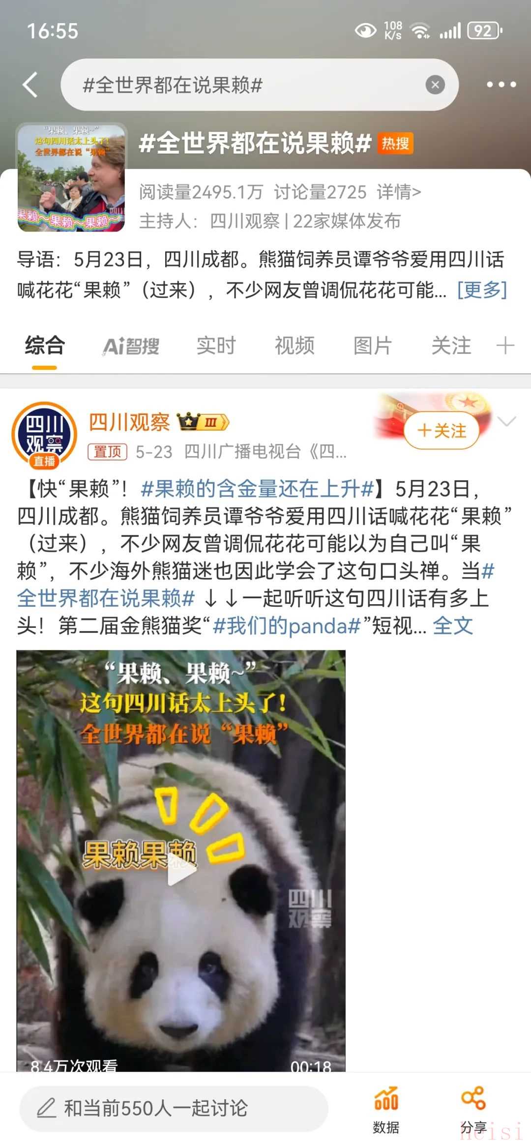 據(jù)介紹,活動啟動當(dāng)日,四川觀察發(fā)布相關(guān)微博22條,相關(guān)話題詞9個,閱讀量超7100萬,斬獲11個熱搜。其中,“全世界都在說果賴”話題閱讀量超2500萬人次,全國榜位第30位?!白T爺爺喊金熊貓果賴”話題閱讀量超2400萬人次,全國榜位第44位。抖音、快手等短視頻平臺斬獲熱搜熱榜5個。