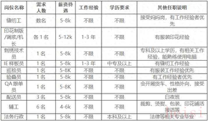 1. 平機(jī)工數(shù)名:計(jì)件,月工資4000元以上2. 燙熨工數(shù)名:計(jì)件工資,月薪5000以上,要有經(jīng)驗(yàn)者3. 落紗工數(shù)名:計(jì)件,月工資4000元以上4. 驗(yàn)貨員數(shù)名:計(jì)件工資,4000以上5. 電腦橫機(jī)工數(shù)名:計(jì)件工資,月薪5000以上,要有經(jīng)驗(yàn)者6. 一線工人數(shù)名:縫合工、碼邊工、釘扣鎖眼工,要求熟練工、計(jì)件,月工資4000元以上以上崗位交五險(xiǎn)。03聯(lián)系方式