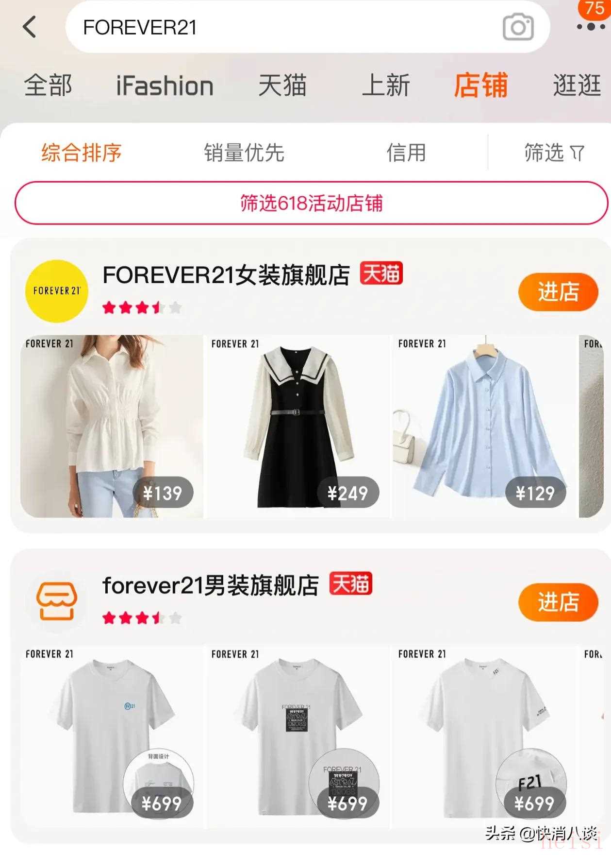 小八看到,目前在淘寶上有Forever 21女裝天貓旗艦店和男裝旗艦店。