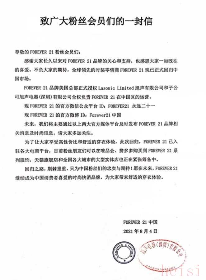 從網(wǎng)絡截圖并蓋有公章的聲明中,記者看到,F(xiàn)orever21品牌美國總部正式授權Lasonic Limited旭聲有限公司和子公司旭聲電器(深圳)有限公司全權負責Forever21在中國的業(yè)務運營。Forever21現(xiàn)已入駐唯品會、拼多多兩大電商平臺,天貓旗艦店和全國各大城市的大型實體店也在籌備中。