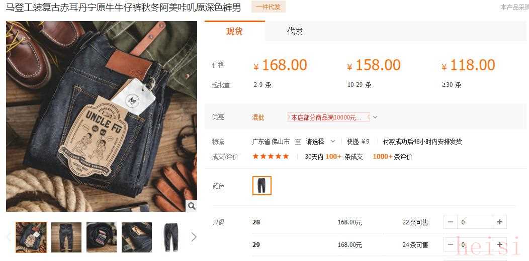 這次推薦的阿美咔嘰, 復(fù)古工裝, 原牛赤耳牛仔褲, 有日系, 美系風(fēng)格,大部分產(chǎn)品百元左右, 甚至有低于百元的牛仔褲, 而且是赤耳單寧的材質(zhì), 我覺(jué)得性價(jià)比很高了。