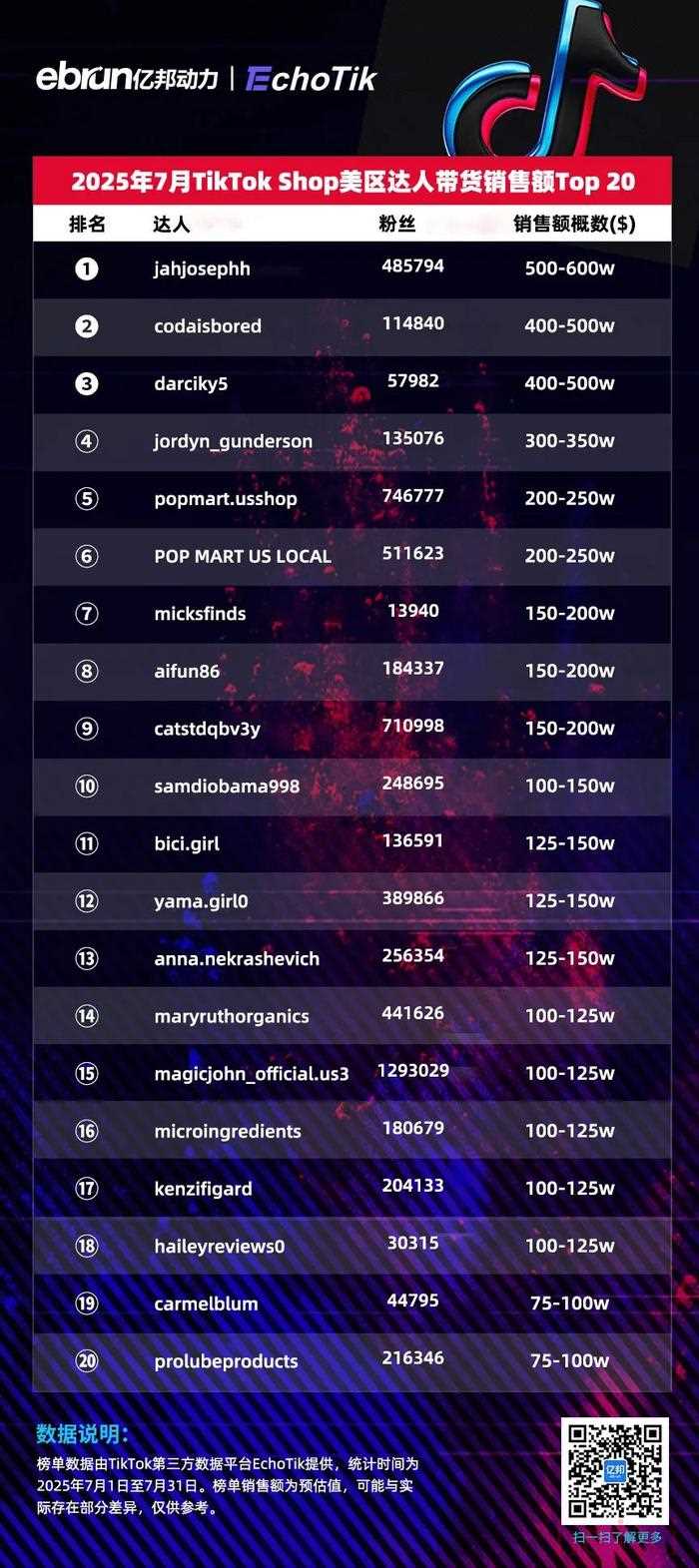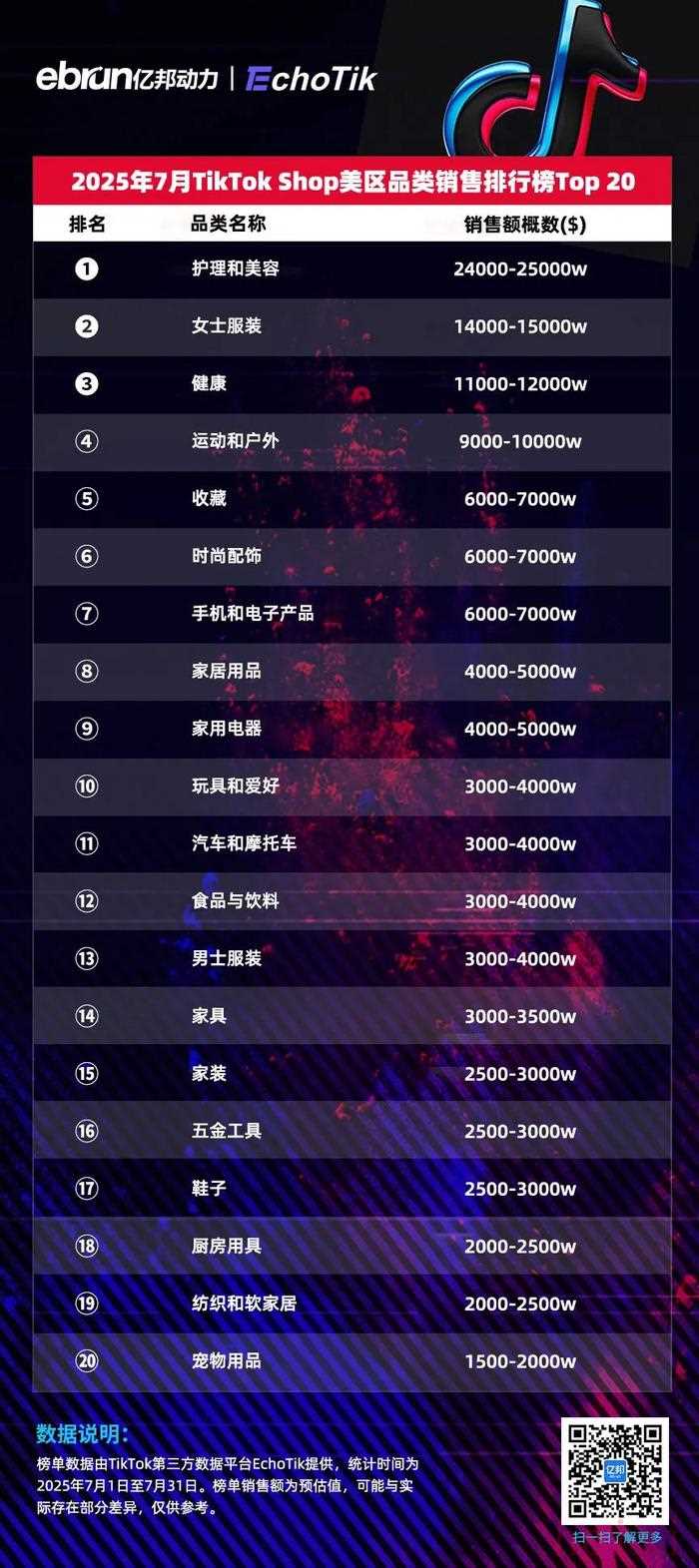 本文數(shù)據(jù)由TikTok第三方數(shù)據(jù)平臺(tái)EchoTik提供,統(tǒng)計(jì)時(shí)間為2025年7月1日至7月31日。榜單銷(xiāo)售額為預(yù)估值,可能與實(shí)際存在部分差異,僅供參考。