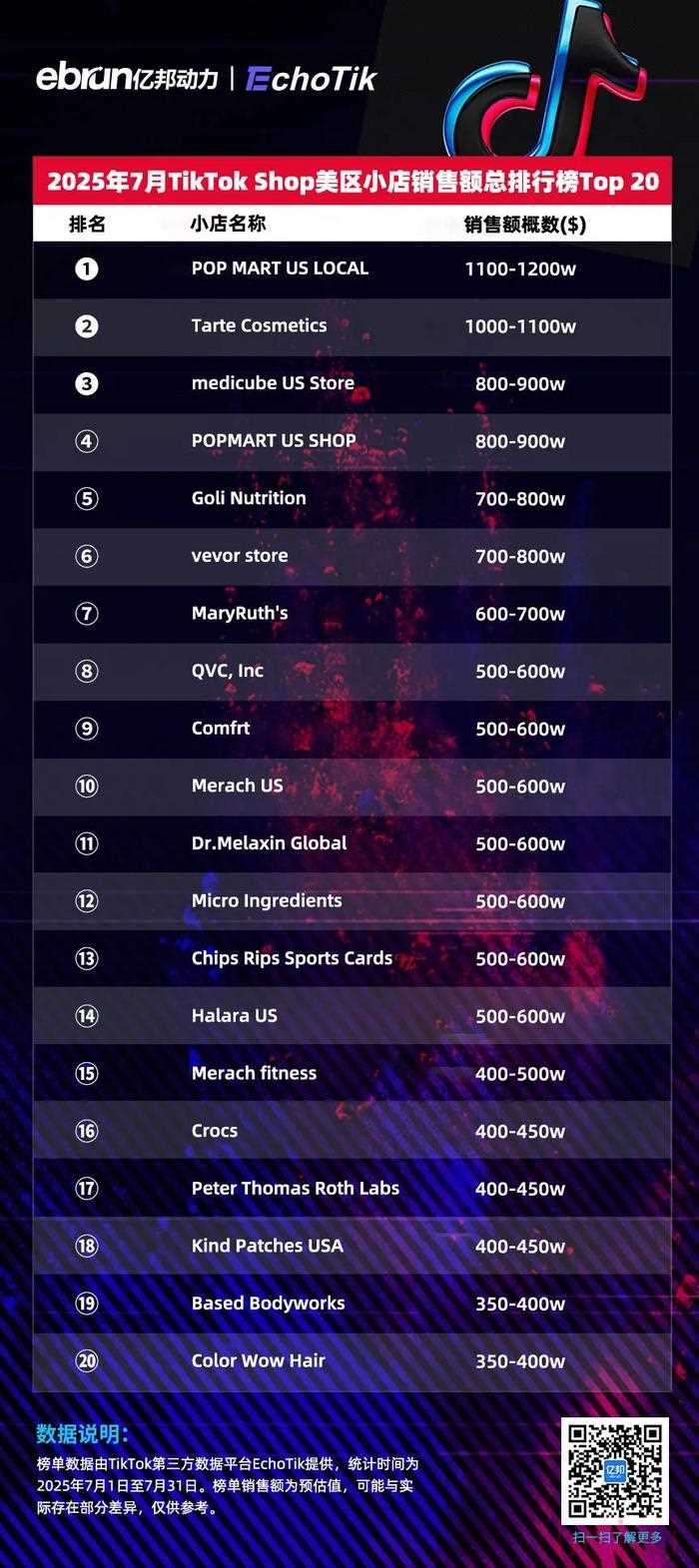 【億邦原創(chuàng)】2025年7月,TikTok Shop美區(qū)整體銷(xiāo)售額進(jìn)一步增長(zhǎng)。中國(guó)潮玩品牌泡泡瑪特(POPMART)旗下兩店持續(xù)發(fā)力,POP MART US LOCAL以1100-1200萬(wàn)美元、POPMART US SHOP以800-900萬(wàn)美元的預(yù)估月銷(xiāo)售額穩(wěn)居總榜前列,全球頭部潮玩品牌的地位進(jìn)一步鞏固。