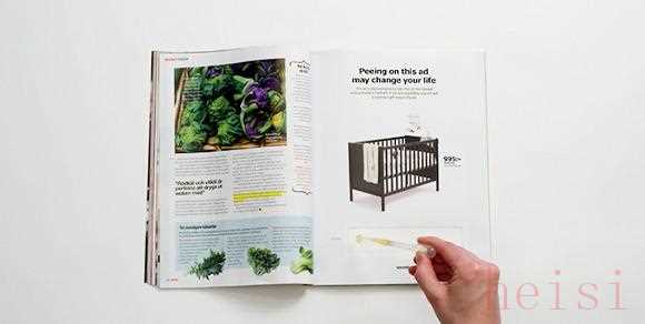 另一則花樣很多的廣告則是為了宣傳旗下的嬰兒床產(chǎn)品線:他們在雜志內(nèi)頁附了一張看起來是普通廣告,實(shí)際有驗(yàn)孕試紙功能的內(nèi)頁。當(dāng)女性用尿液浸透紙張,若是懷孕,廣告上的嬰兒床原價(jià)下方會(huì)浮現(xiàn)出一個(gè)紅字顯示的新價(jià)格。拿著這張確認(rèn)懷孕的廣告,就可以去宜家店內(nèi)獲得近一半的嬰兒床折扣。