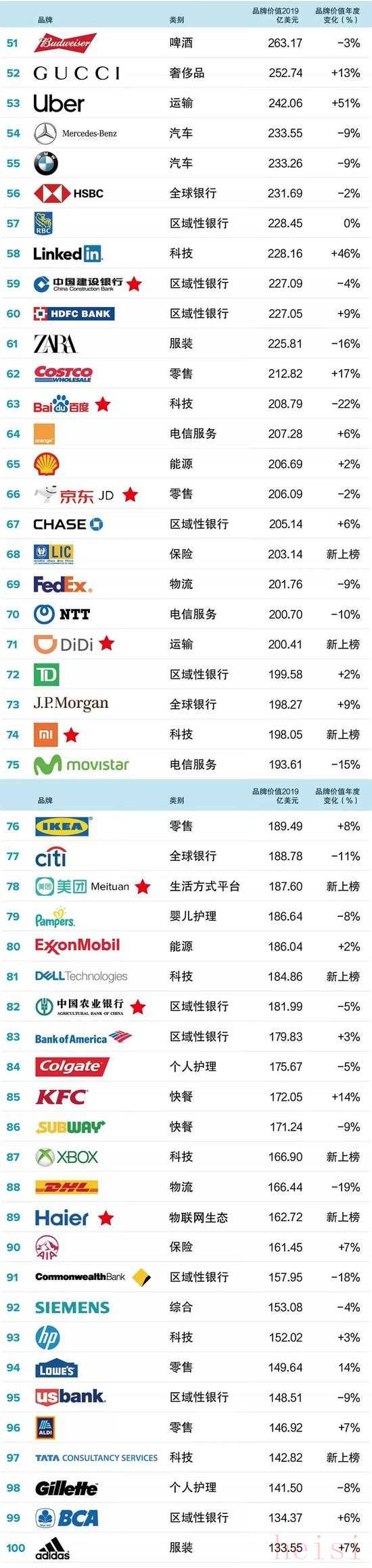 * 今年100強(qiáng)榜單上共有9個(gè)新上榜品牌,主要來自于中國(guó)和美國(guó)的顛覆性科技品牌,如戴爾科技、Xbox、海爾、美團(tuán)和小米;