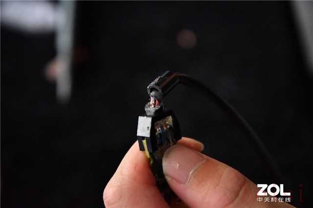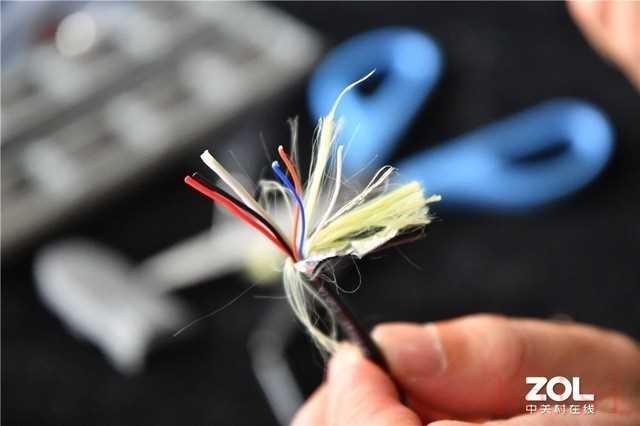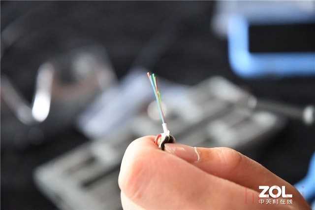 大家都知道,尋常光纖非常脆弱,F(xiàn)IBBR使用的光纖線材有內(nèi)外兩層保護(hù)(圖中彩色外皮與白色外皮),結(jié)合外部的抗拉纖維以及非常厚的黑色外皮,光纖的安全有強(qiáng)大可靠的保障。同時(shí),筆者發(fā)現(xiàn),只有在拆解之后對(duì)單根光纖進(jìn)行190度以上的對(duì)折、并給予足夠壓力才會(huì)折斷,正常未拆解的狀態(tài)下幾乎沒(méi)有辦法損壞,全球著名品牌長(zhǎng)飛光纖特供的“彎貝BendRobust特種抗彎光纖”果然名不虛傳。