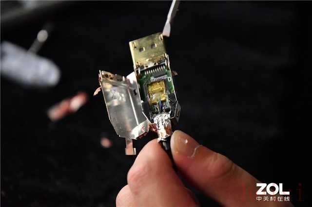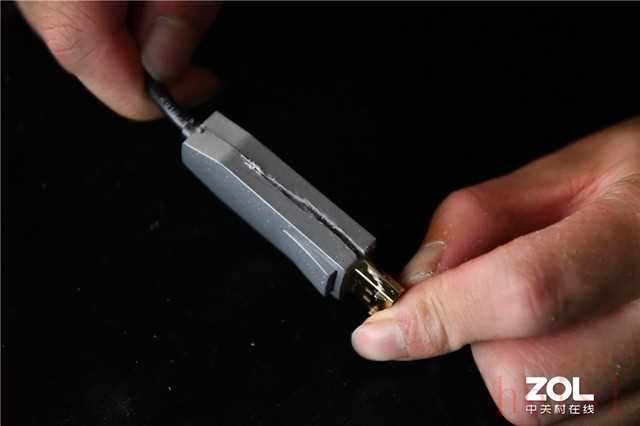 現(xiàn)在,我們?yōu)榱俗尵€身束手就擒,一覽無(wú)余,開(kāi)始破解它的連接部位。在柔軟的線材和接頭之間,這個(gè)連接部位是脆弱區(qū),很多線材都不能很好的維持它的堅(jiān)固性,比如被詬病很久的蘋(píng)果充電線。而FIBBRFlash 144光纖DP線對(duì)這個(gè)區(qū)域的材料進(jìn)行加厚加長(zhǎng),我們切割了好久才取下它,一個(gè)細(xì)節(jié)呈現(xiàn)工藝的嚴(yán)苛性,代表對(duì)品質(zhì)的卓越追求。