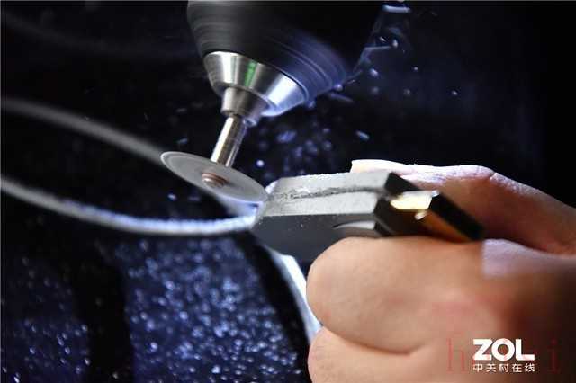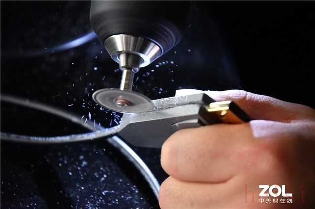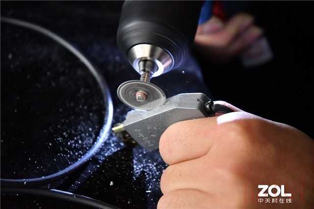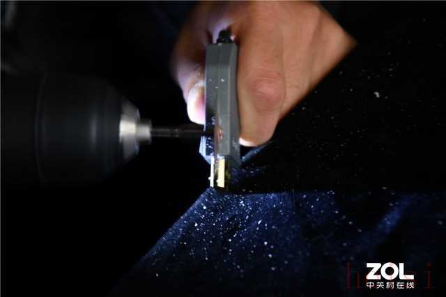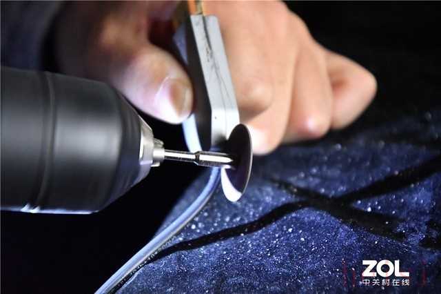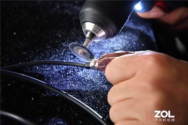 我們直接正面剛,上電鉆(因?yàn)橹坝闷渌ぞ叨家允「娼K),只有電鉆才能激速掀起它神秘的面紗。首先,需要在FIBBRFlash144光纖DP線的接頭處開(kāi)一個(gè)凹槽,用附帶磨片的電鉆沿著DP線接頭處兩側(cè)打磨;接頭兩側(cè)在出廠前已緊密貼合在一起,非常牢固并且毫無(wú)縫隙,或使用了膠封處理。