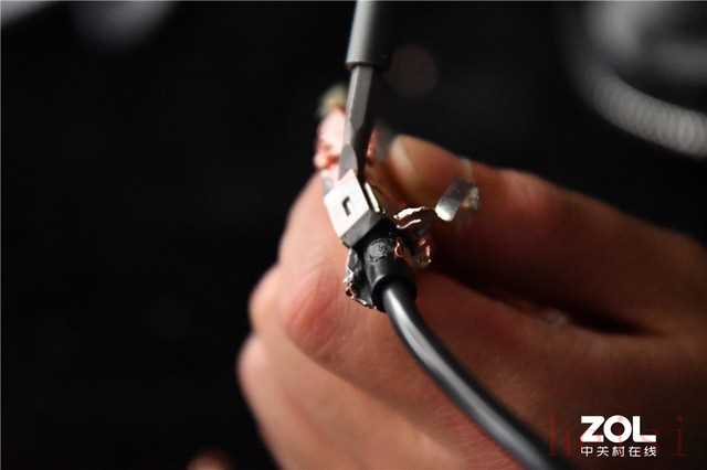 解開(kāi)了線材外衣,沒(méi)想到還有一個(gè)關(guān)卡:接頭的尾部有一個(gè)金屬卡環(huán),緊緊箍住光纖線的尾部,真是咬定青山不放松呀~