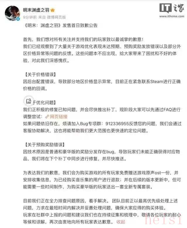 據(jù)了解,玩家差評(píng)主要集中在優(yōu)化差、發(fā)售當(dāng)天外區(qū)價(jià)格永久降價(jià)、游戲版本獎(jiǎng)勵(lì)發(fā)錯(cuò)等方面。對(duì)此,《明末:淵虛之羽》官方微博上周四發(fā)布致歉聲明,就玩家反饋的游戲優(yōu)化表現(xiàn)未達(dá)預(yù)期、預(yù)購(gòu)獎(jiǎng)勵(lì)發(fā)放錯(cuò)誤、部分外區(qū)價(jià)格異常等問題進(jìn)行回應(yīng)。