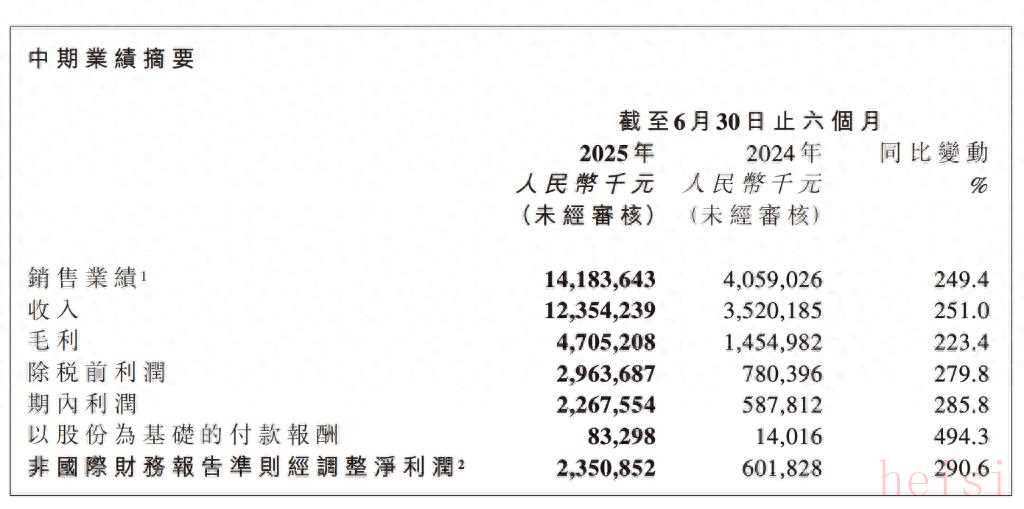 8月20日,古法手工金器第一品牌——老鋪黃金發(fā)布截至2025年6月30日止六個月中期業(yè)績顯示,上半年營業(yè)收入達123.54億元,同比增長251%,凈利潤22.68億元,同比增長285.8%,經(jīng)調整凈利潤達23.5億元,同比增長291%。