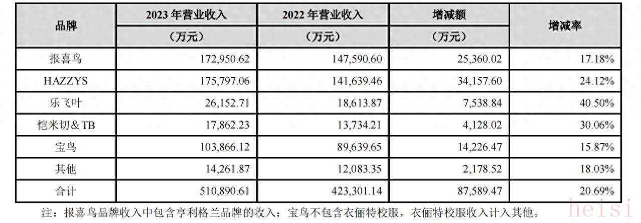 2023年,報(bào)喜鳥(niǎo)旗下各品牌均錄得增長(zhǎng)。其中,三大品牌哈吉斯、報(bào)喜鳥(niǎo)和寶鳥(niǎo)的營(yíng)收分別為17.58億元、17.30億元和10.39億元,增速分別為24.12%、17.18%和15.87%。這三大品牌合計(jì)貢獻(xiàn)了總營(yíng)收的近九成。